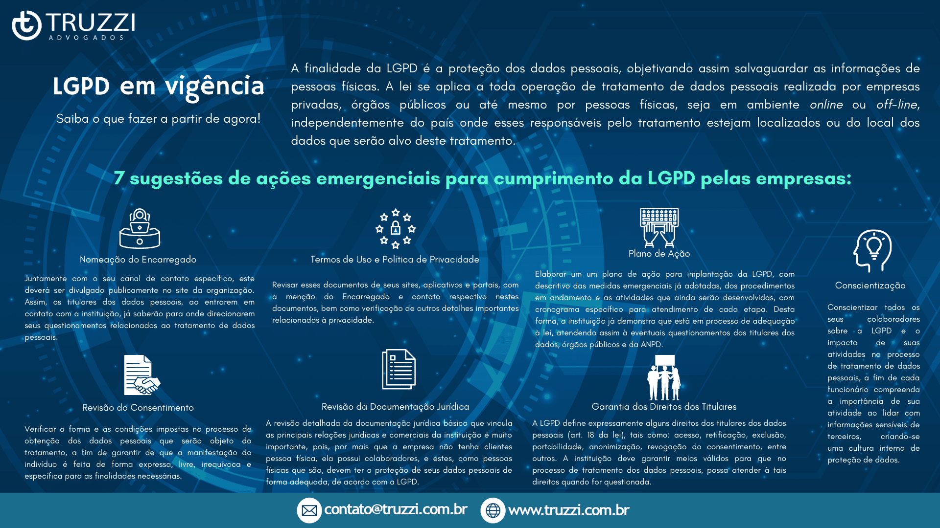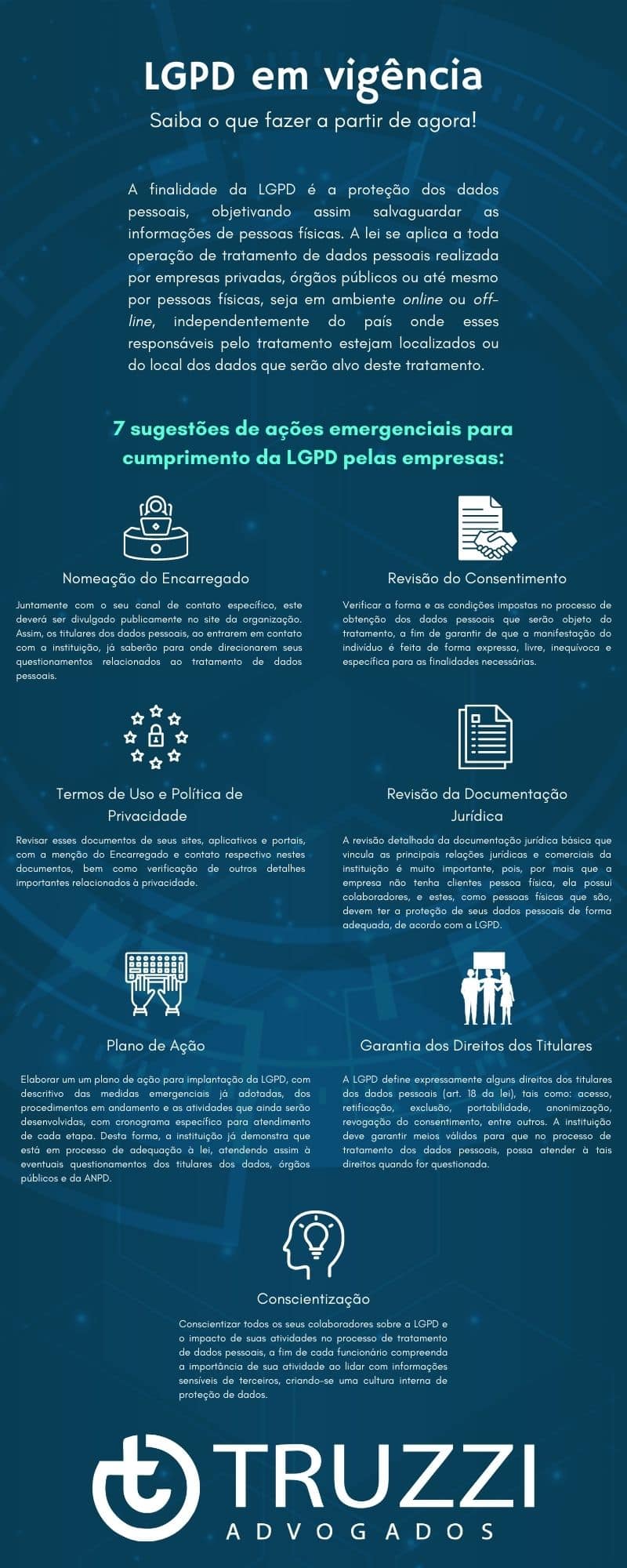 Este infográfico foi elaborado com base no artigo: “A LGPD entrou em vigor. O que as empresas devem fazer agora?”, redigido pela dra. Gisele Truzzi e publicado nos portais ISTOÉDinheiro e CONJUR.